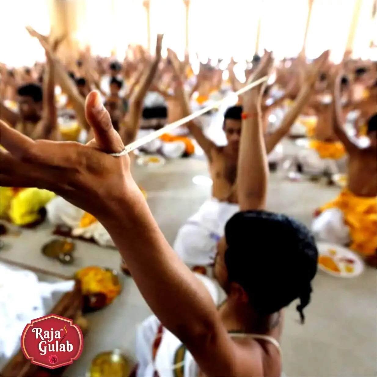 In Hinduism, the Yellow Janeu, or yellow thread, stands for purity and is very important in holy ceremonies and puja. It is a sign of their spiritual journey worn by Brahmins at different events. Pila is a color that means purity and knowledge, so it was a good choice for this holy thread.